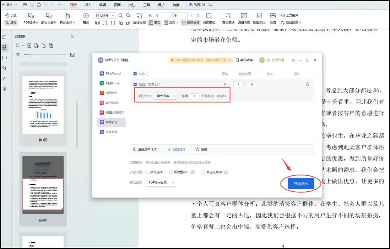 在弹出窗口中选择分割方式(按页码、按章节或自定义范围),设置输出路径。