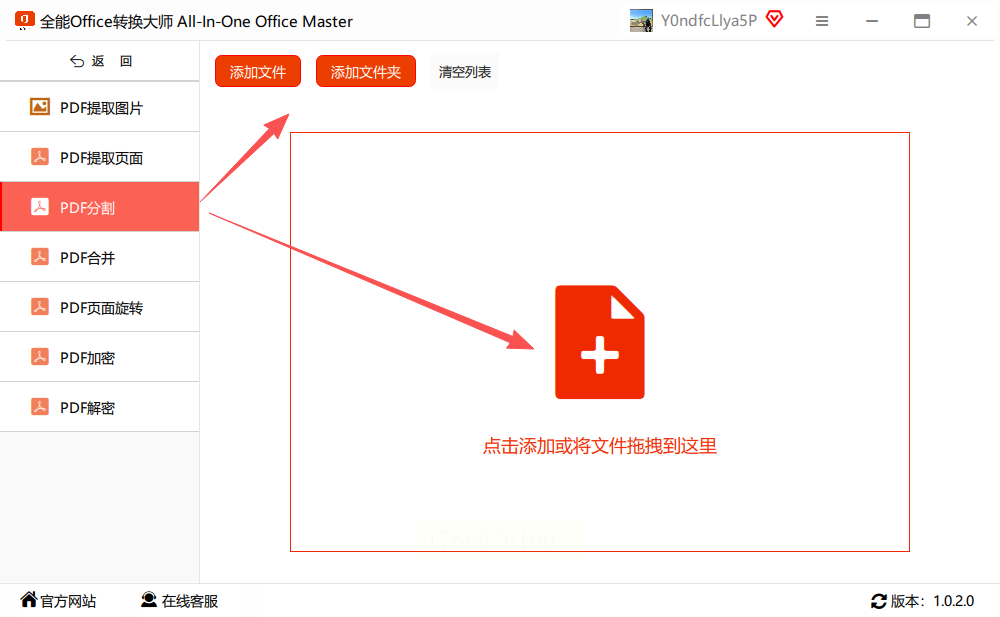 点击“添加文件”按钮,将需要分割的PDF拖入或上传。