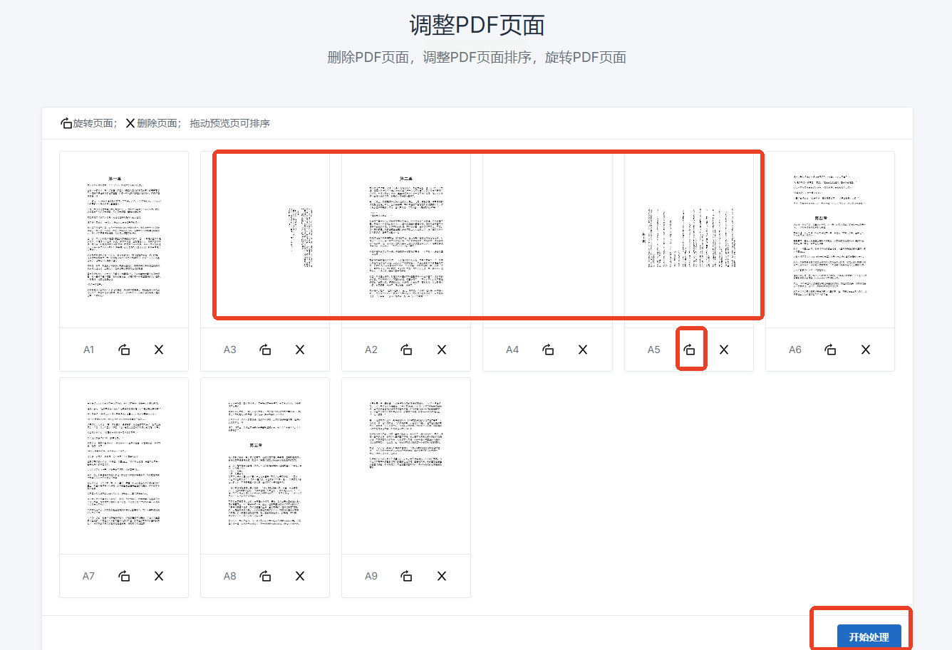 步骤三:你可以用鼠标拖拽缩略图来调整页面顺序。要旋转页面,就点击每个缩略图下方的旋转图标。