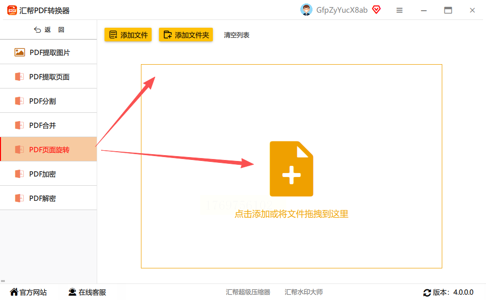 步骤二:在左侧的功能列表里,选择“PDF页面旋转”。然后,在右侧区域,通过点击“添加文件”或直接拖拽的方式,把你的PDF文件上传进来。它支持一次性上传多个文件进行批量处理,很省时间。
