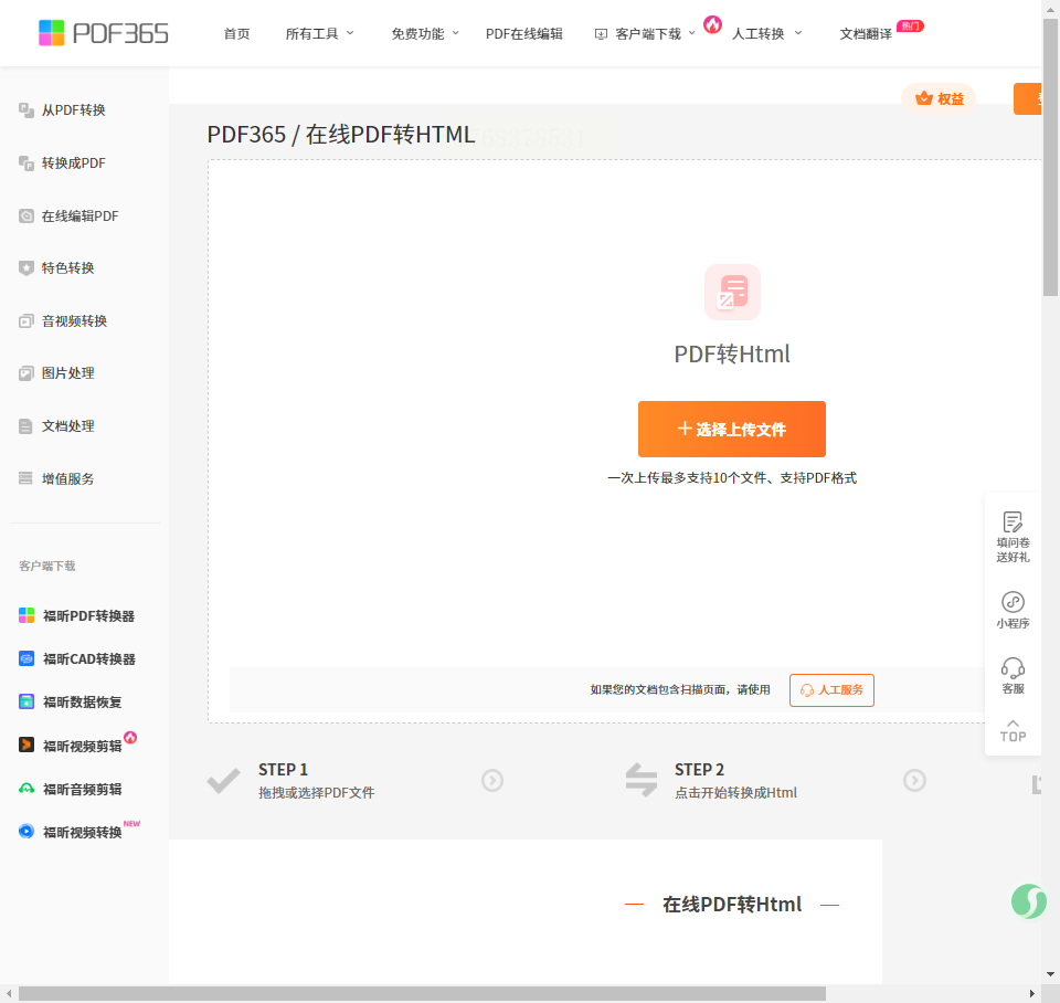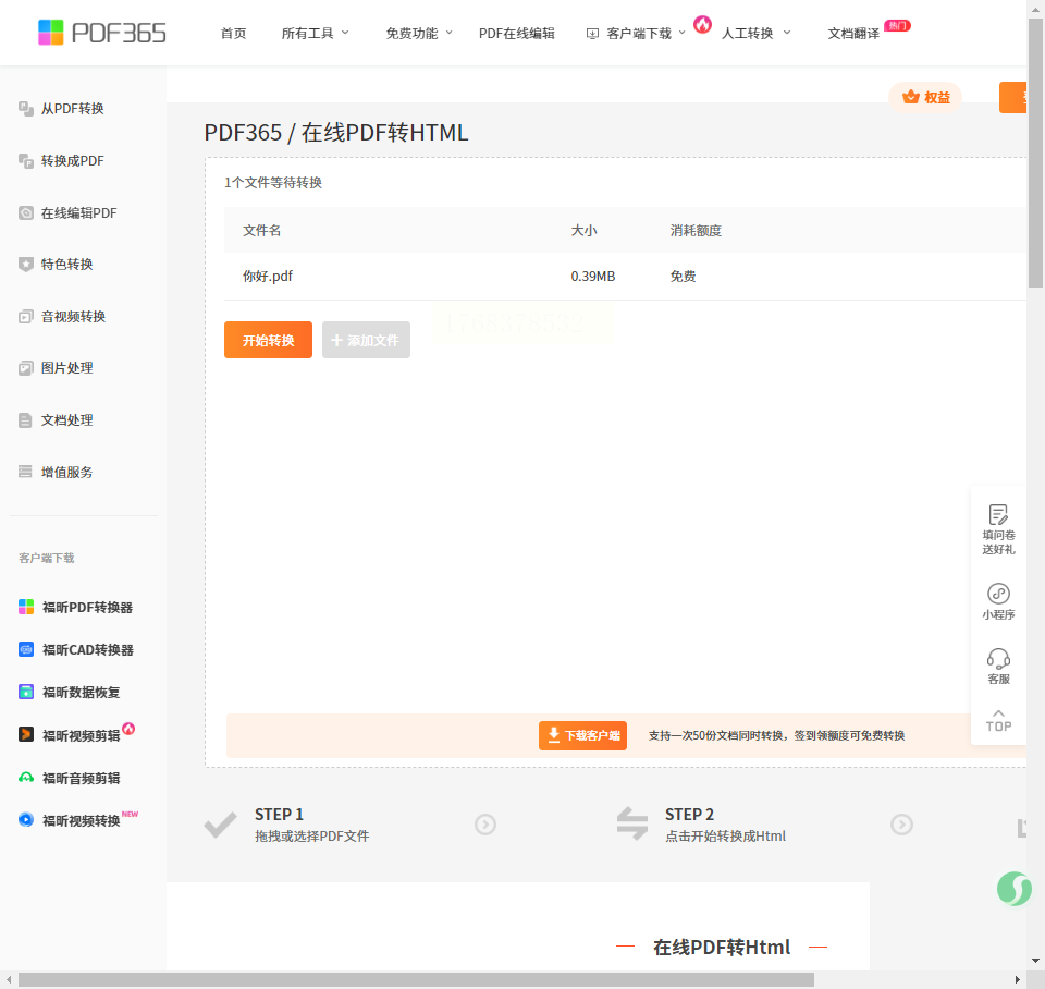 打开Chrome、Edge等主流浏览器,搜索“福昕PDF365在线转换”进入官网。在首页找到“PDF工具”专区,选择“PDF转HTML”功能入口。