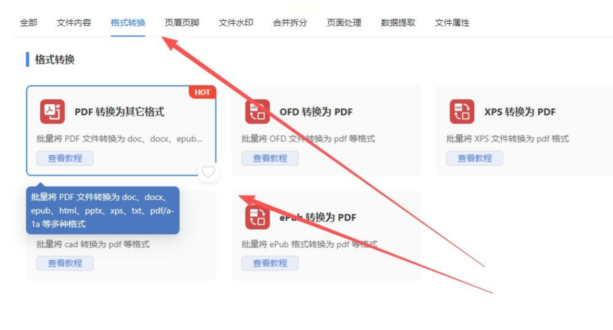 打开软件后,在左侧菜单选择“PDF工具”,右侧分类中找到“PDF转换为其它格式”选项。
