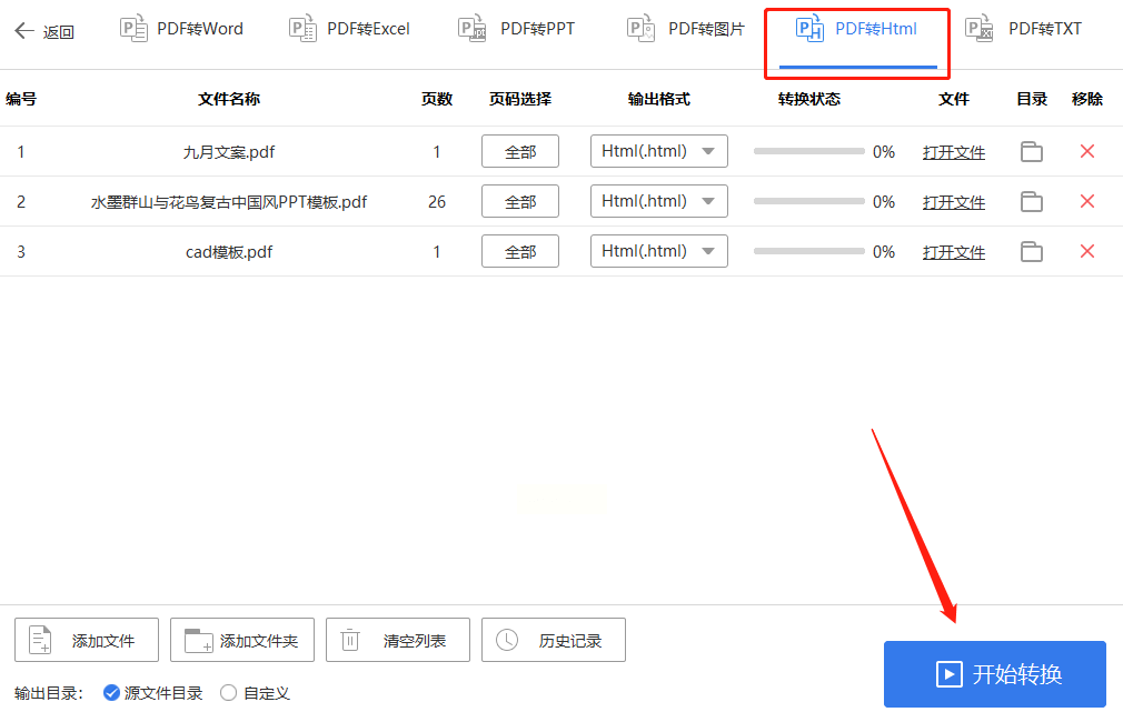 设置输出目录后,点击“开始转换”,软件将自动处理所有文件并生成HTML结果。