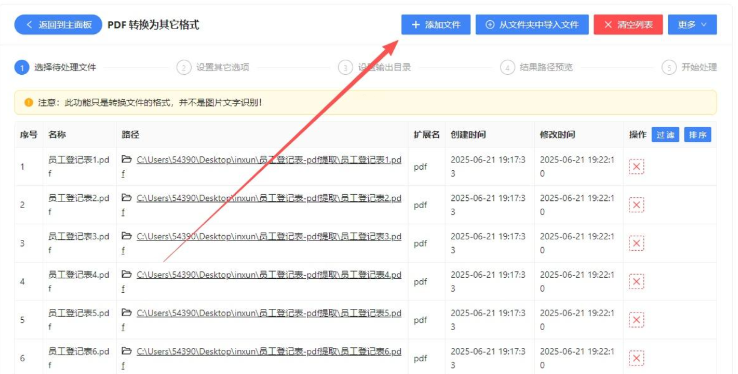 点击“添加文件”或“批量添加”,选择多个PDF文件,支持按文件夹整体导入。