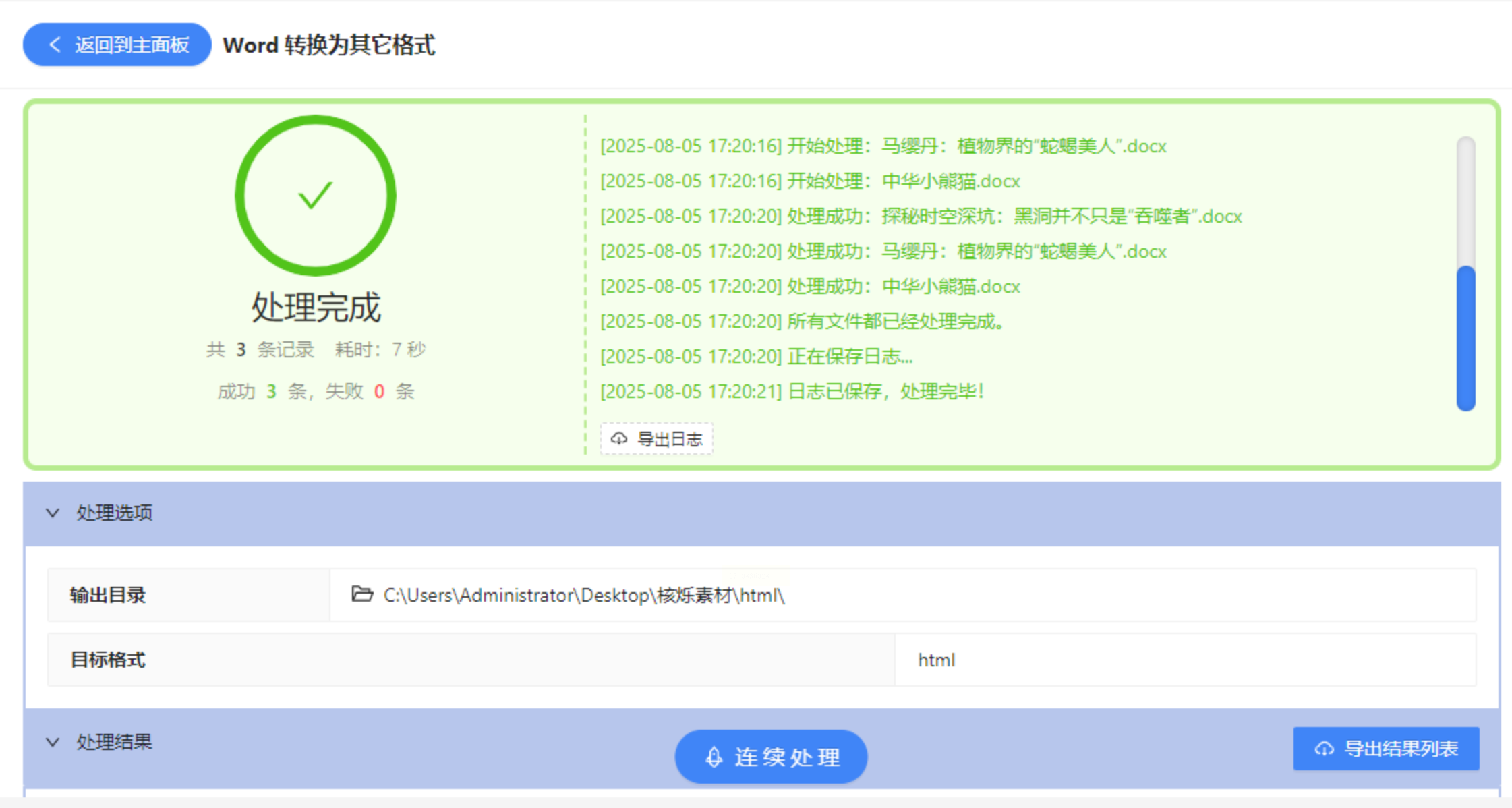 4. 批量转换:勾选"批量处理",选择多个Word文件后点击"开始",软件会自动生成对应HTML文件
