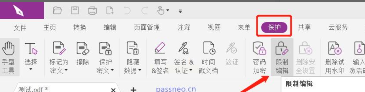 点击菜单栏中的“保护”选项,在下拉菜单中选择“限制编辑”。