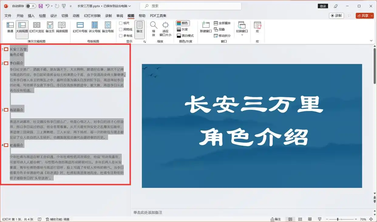 在大纲视图的侧边栏,你可以看到所有幻灯片的文字大纲。按Ctrl+A全选这些文字内容,再按Ctrl+C复制。