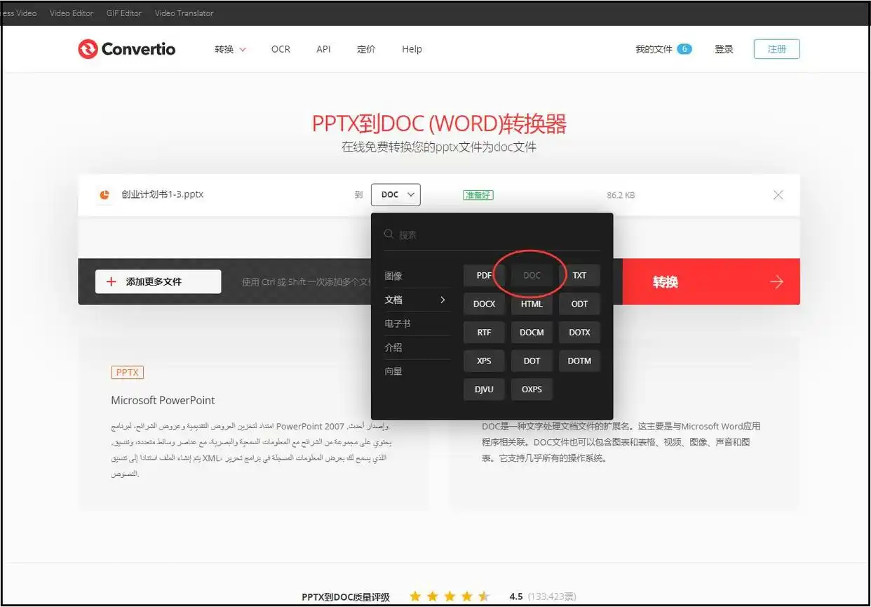 文件上传后,在输出格式列表中,选择“Microsoft Word (DOC)”或“DOCX”。你还可以在高级设置里进行一些微调。