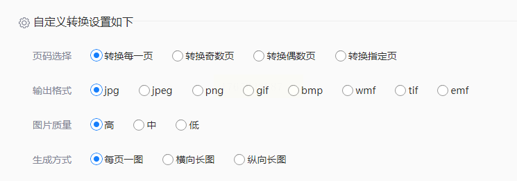 3. 上传之后,可以设置一下图片参数,比如“页码范围”(想转哪几页就选哪几页)、“输出格式”(PNG或JPG)、“图片质量”(高清还是普通)。
