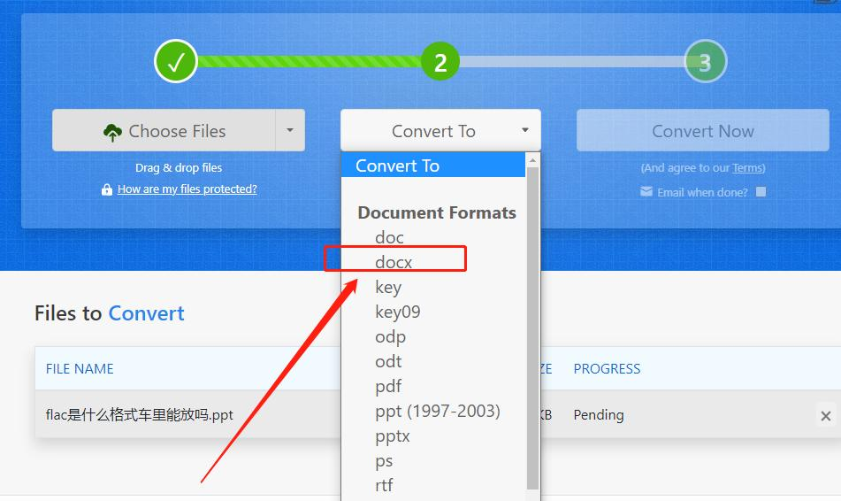 步骤一:打开Zamzar网站,点击“选择文件”按钮上传需要转换的PPT文件。
