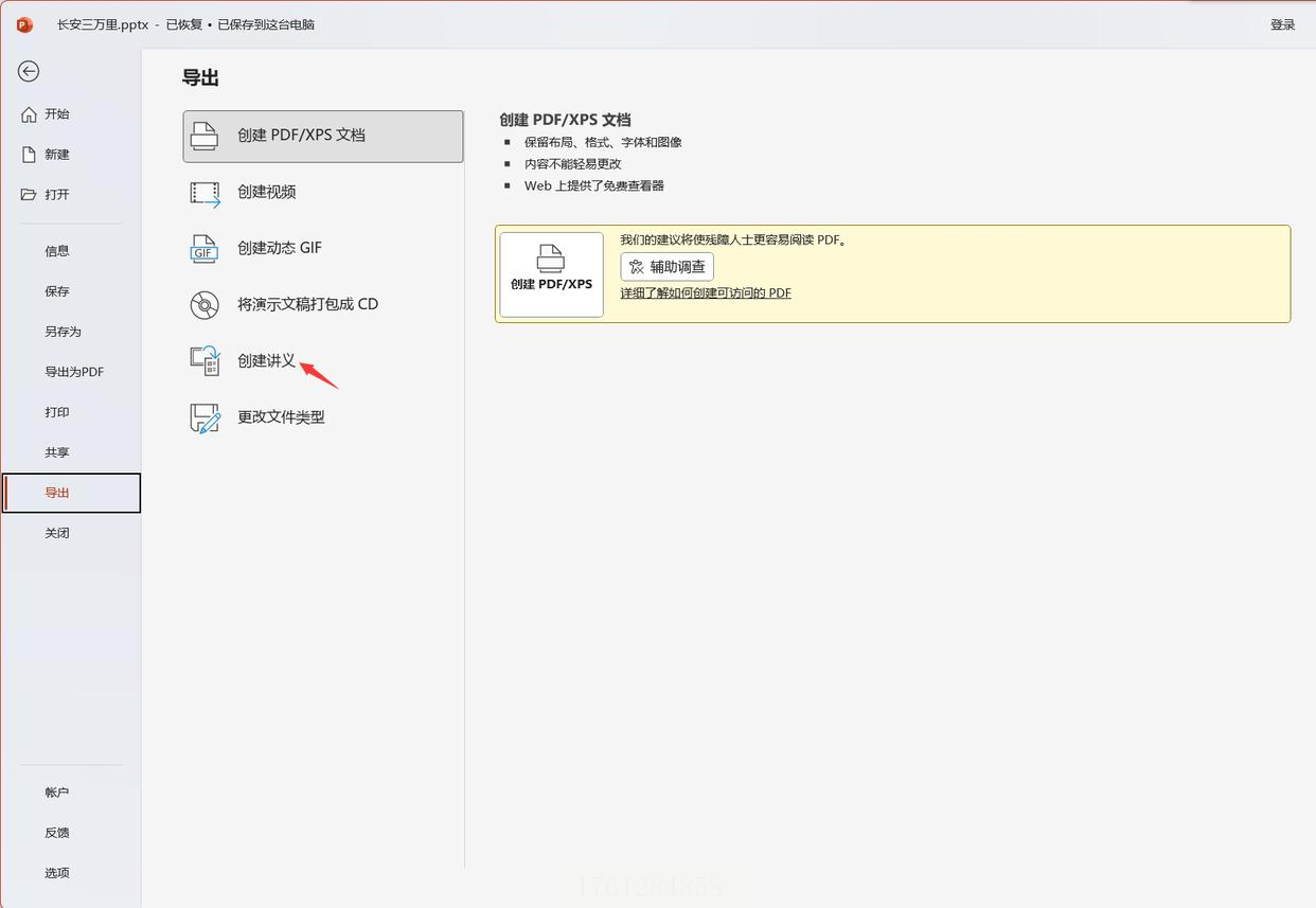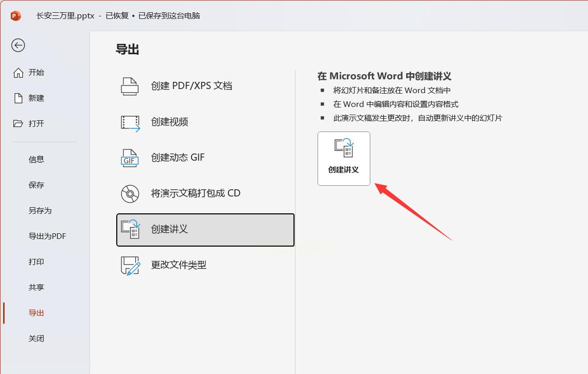 步骤二:在打开的界面中选择“导出”选项,然后点击“创建讲义”功能。