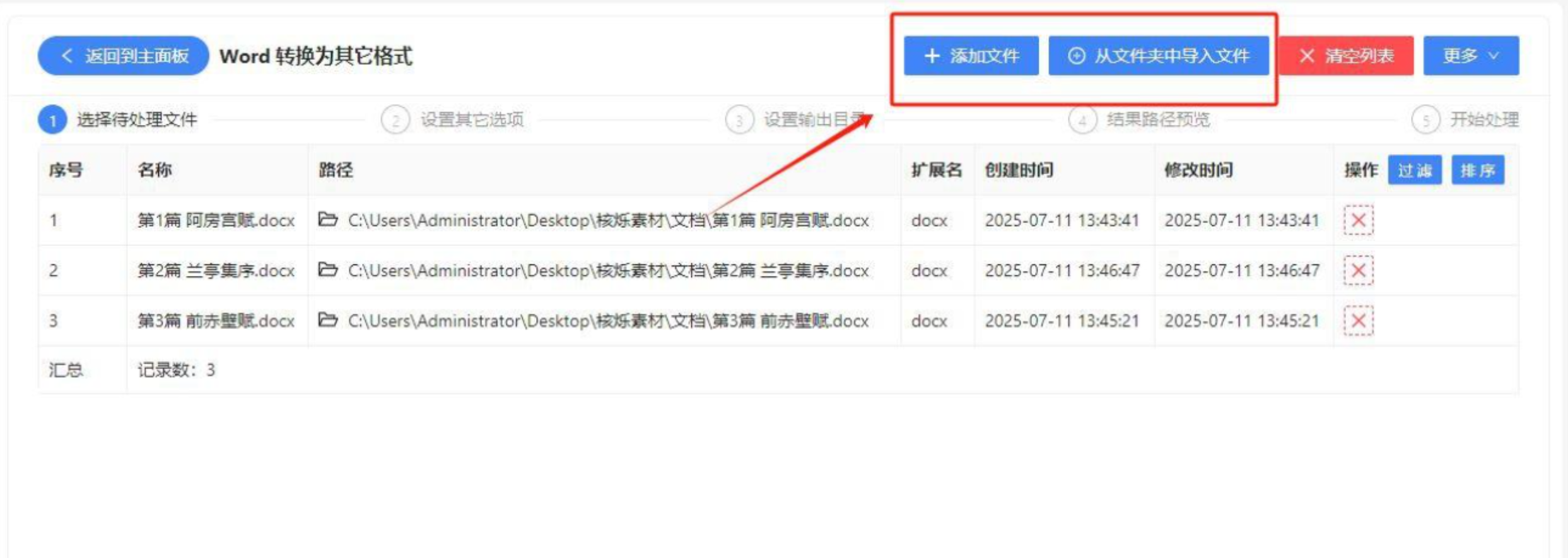 - 批量导入:点击“添加文件夹”,可一次性导入整文件夹的Word文件;