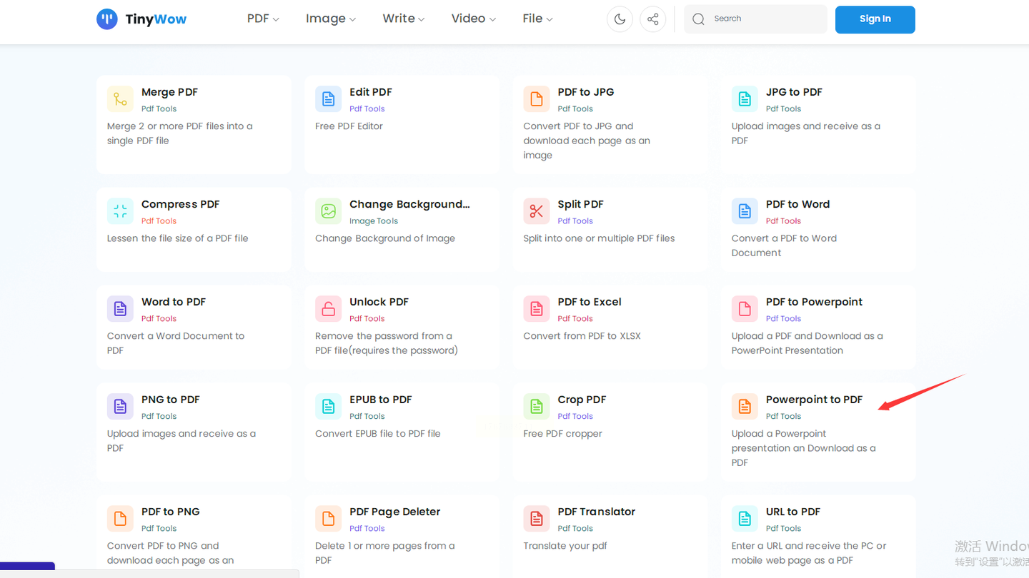 步骤二:在工具列表中定位“PowerPoint to PDF”功能。