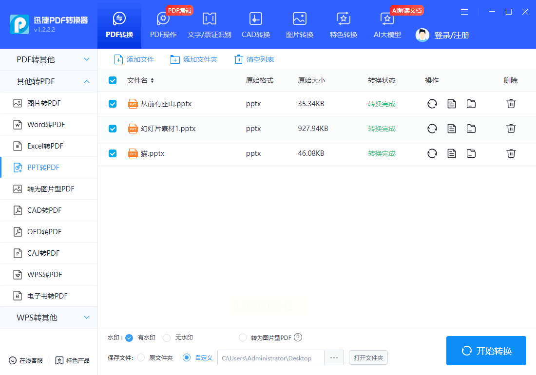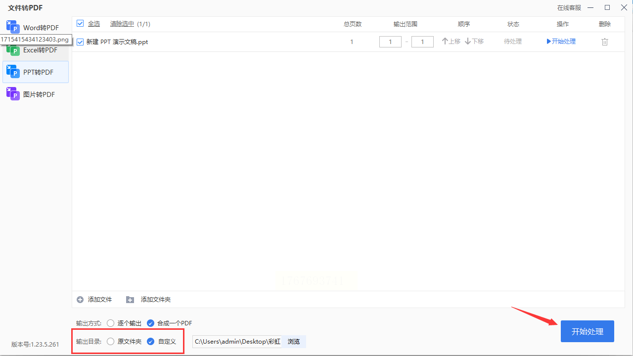 步骤二:上传PPT文档,根据需要调整保存目录、水印等输出设置。