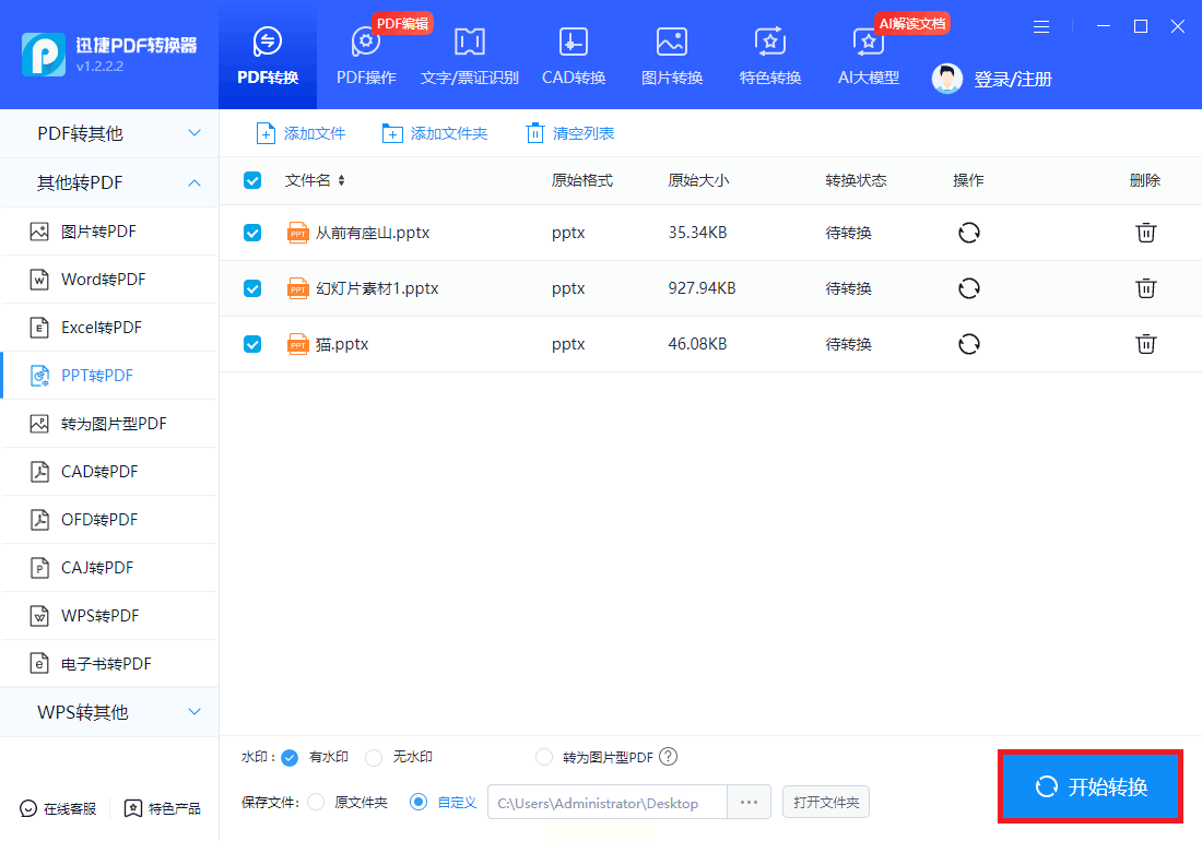 步骤二:上传PPT文件后,可选择输出为不可编辑的PDF以提升安全性,随后点击“开始转换”。