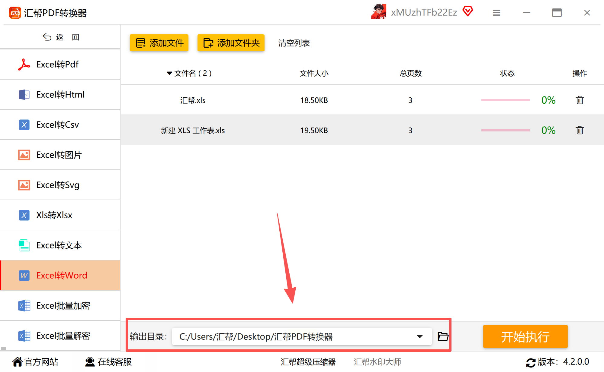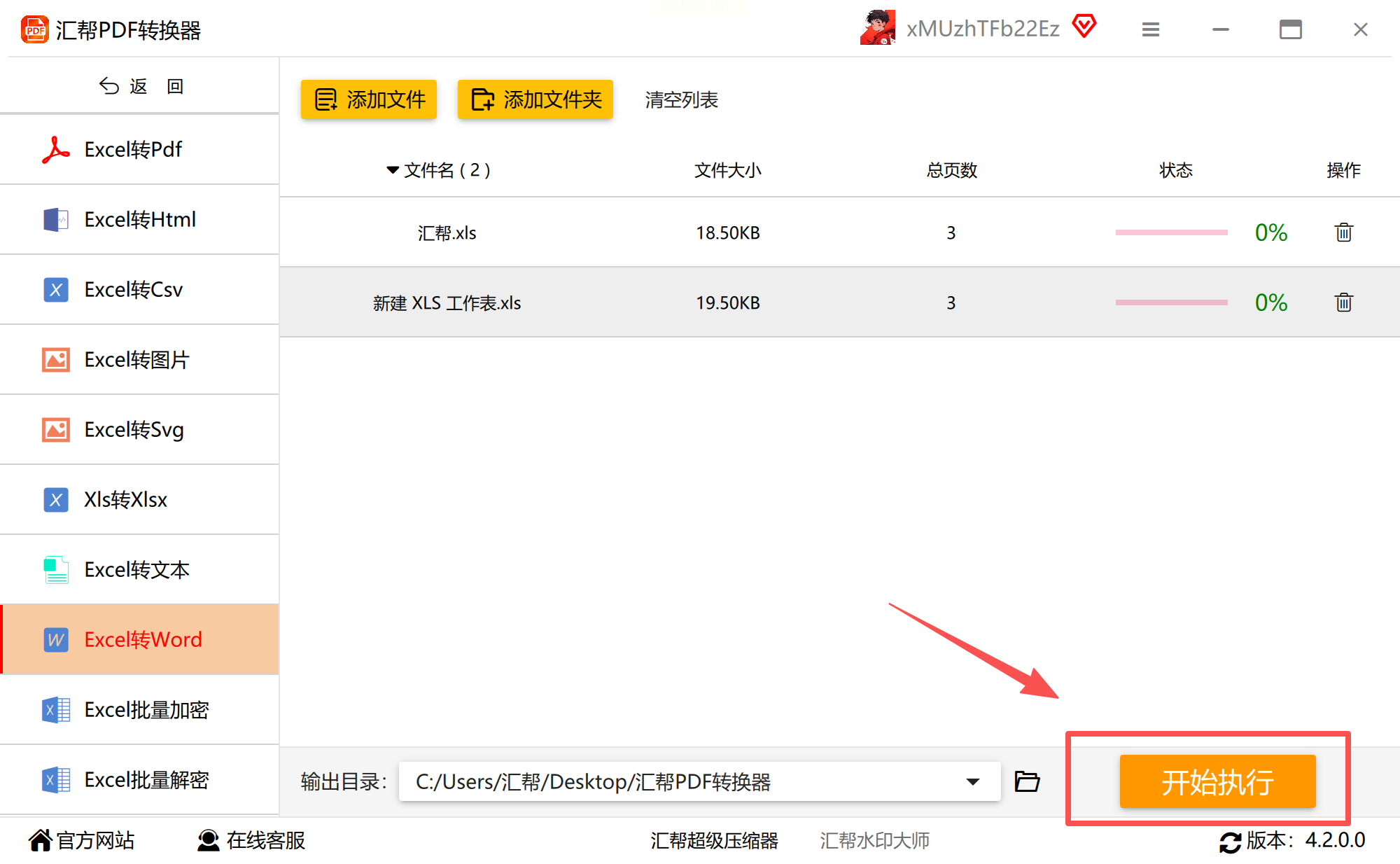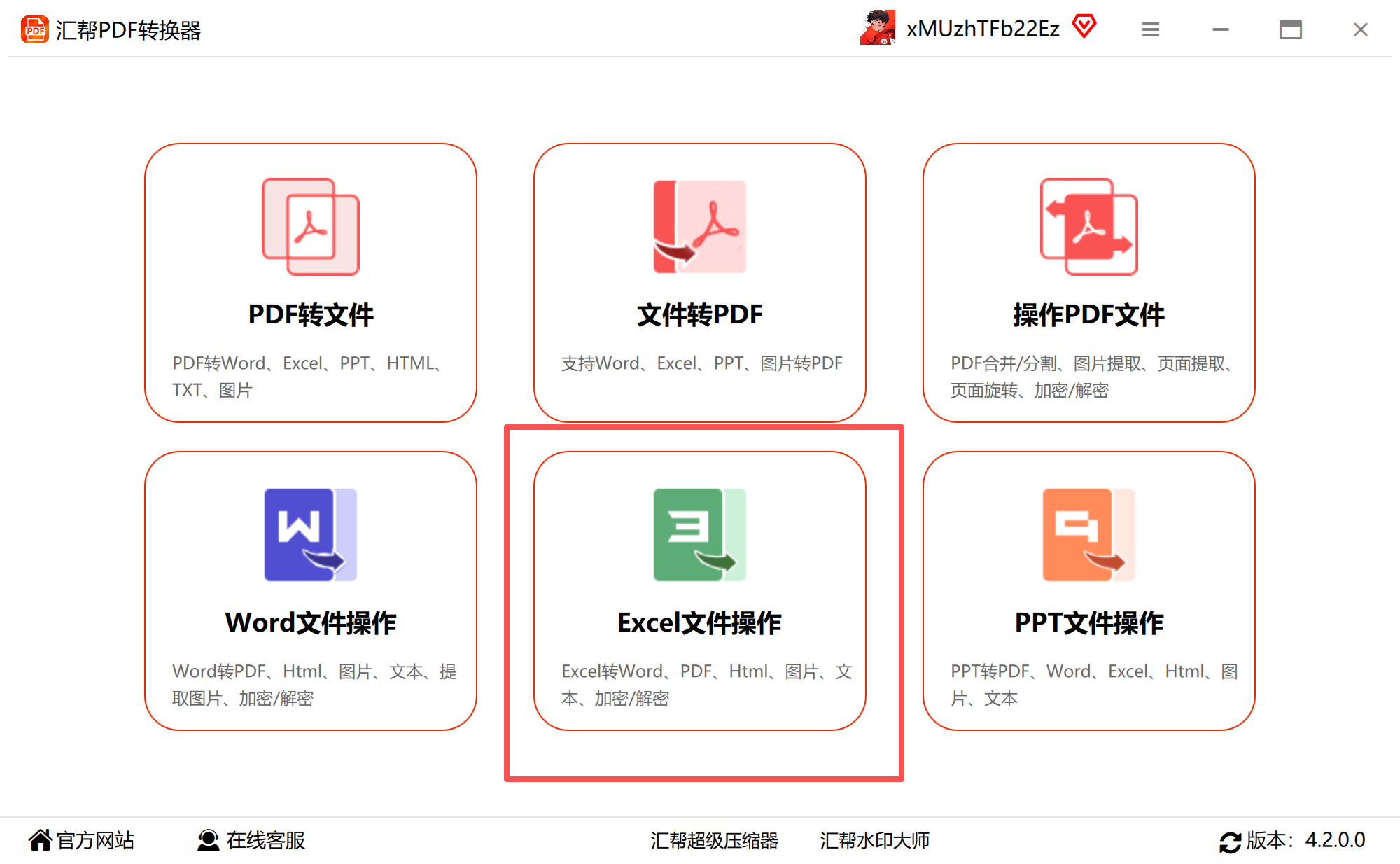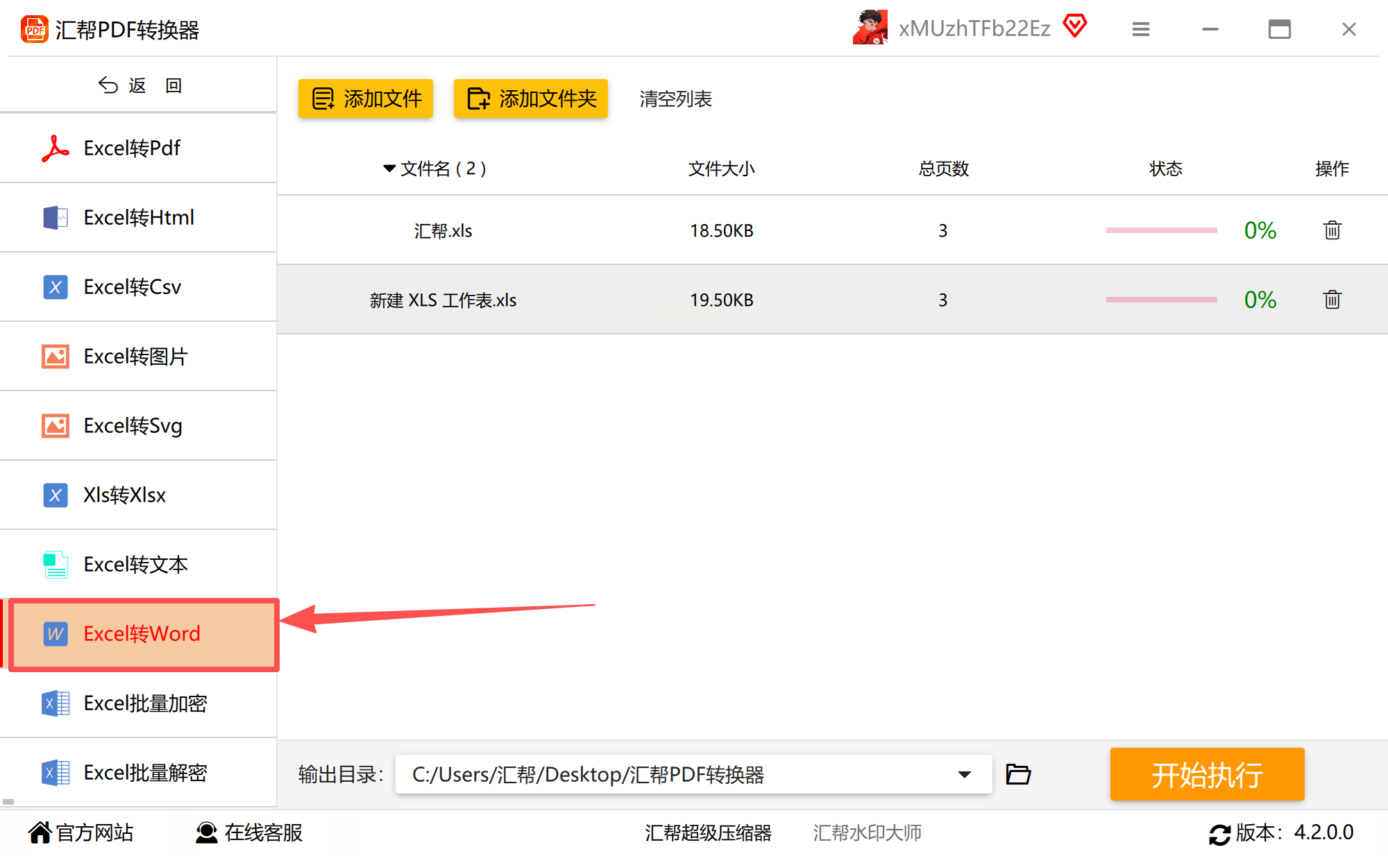 步骤一、启动《汇帮PDF转换器》软件,在主界面找到并选择“Excel转Word”或类似的文档转换功能模块。
