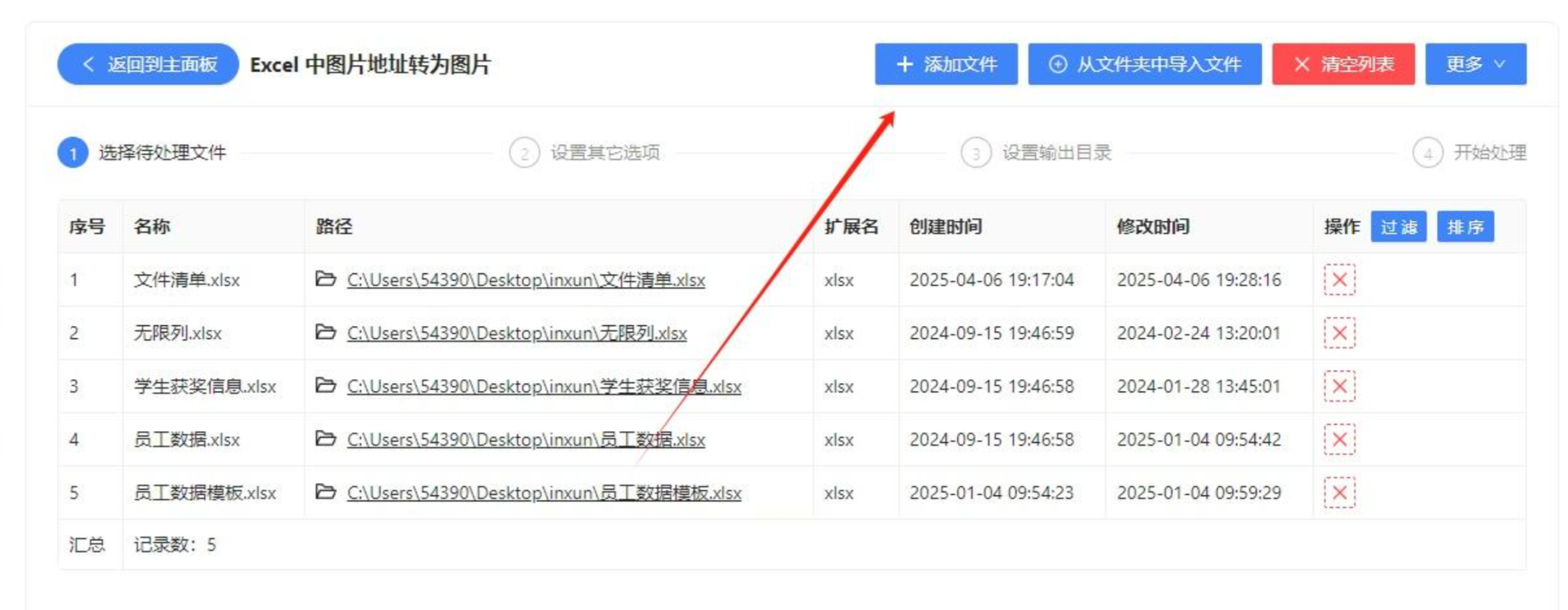 3. 添加文件:点击「添加文件」按钮,选择需要处理的Excel文件,支持批量导入。