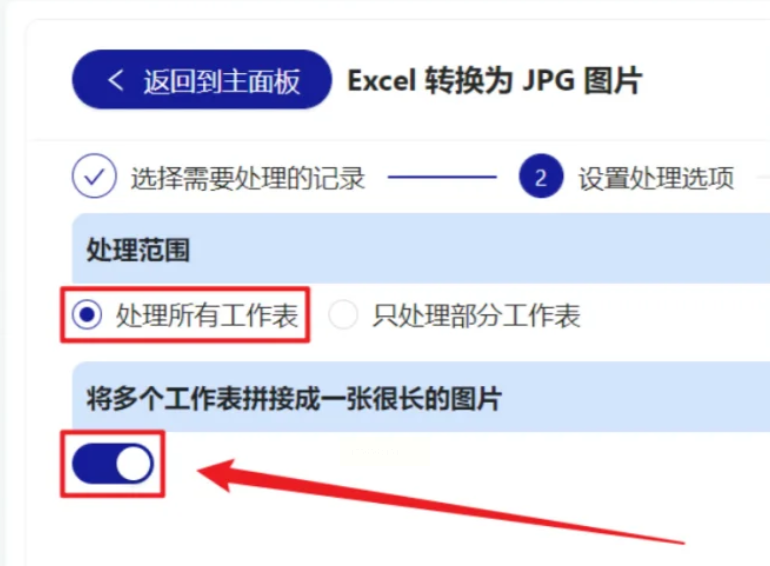 4. 设置处理范围:在弹出的设置窗口中,选择「处理所有工作表」,并勾选「将多个工作表拼接成一张长图」的功能(如果需要的话)。
