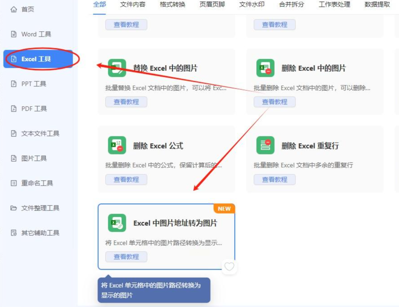 2. 选择转换功能:在右侧的「格式转换」分类中,找到并选择「Excel中图片地址转为图片」的功能。