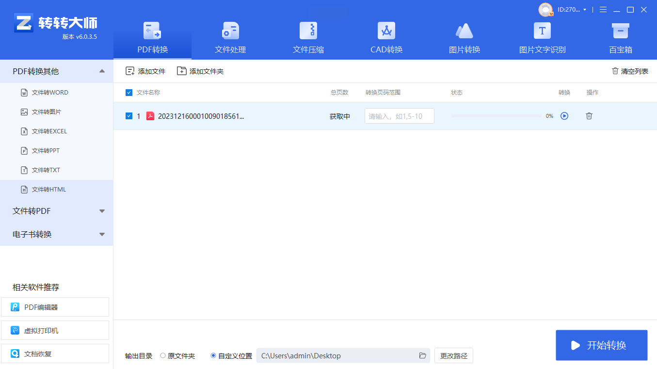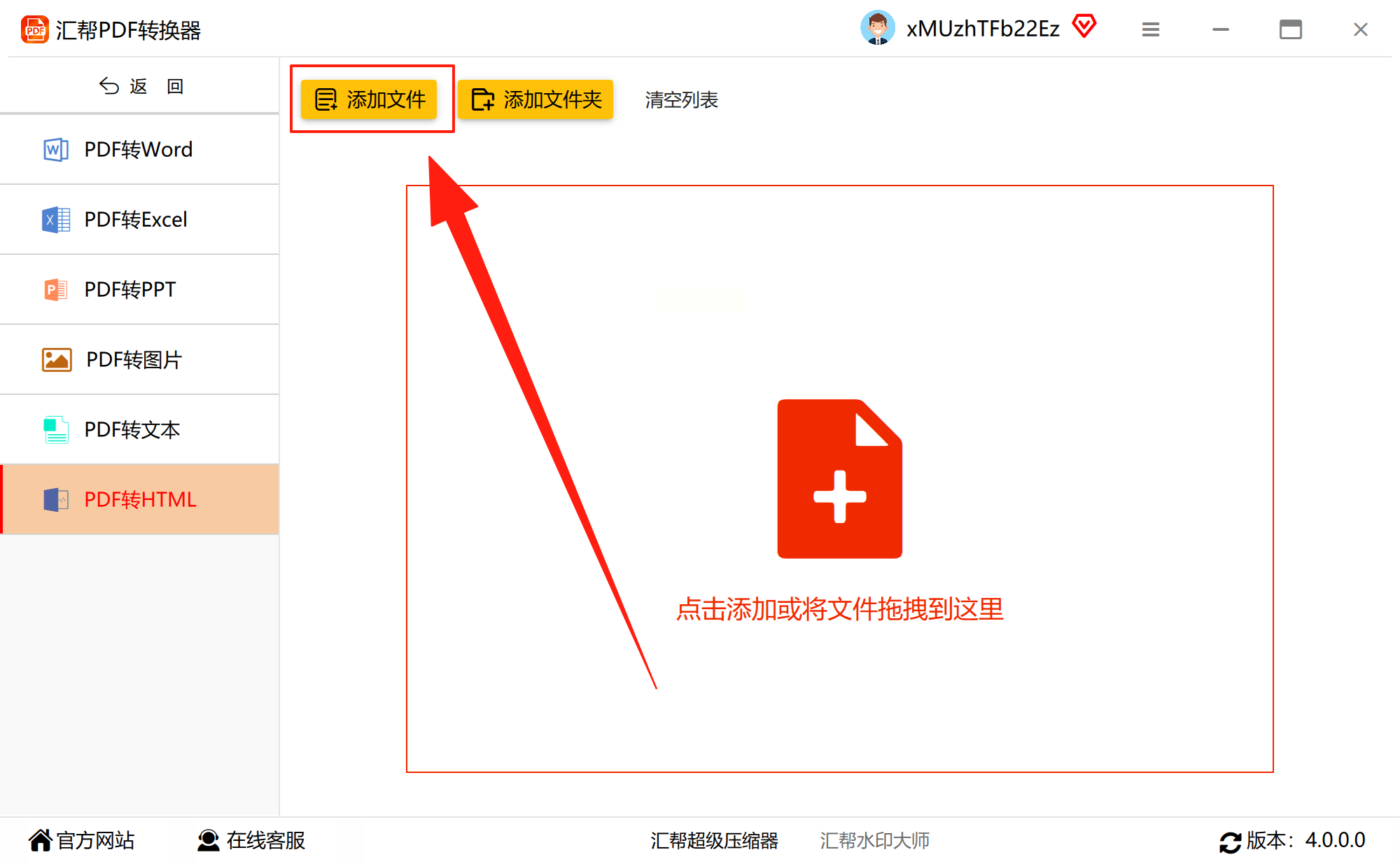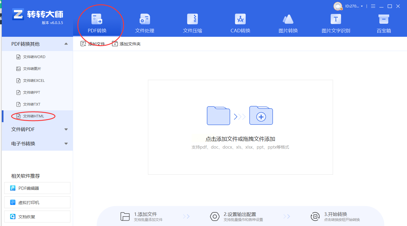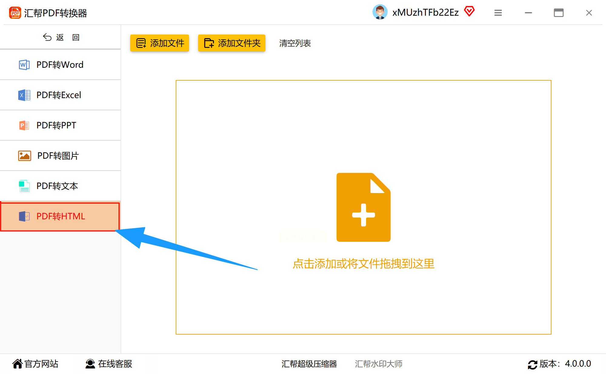 打开汇帮PDF转换器后,在主界面的「格式转换」分类中找到「PDF转文件」选项。该模块不仅支持PDF与Word、Excel等格式的互转,更在子菜单中单独设置了「PDF转HTML」专项功能,确保转换路径的精准性。