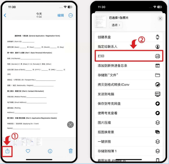 2. 选好图片后,点击左下角的"分享"图标,在弹出的功能菜单中找到"打印"选项。