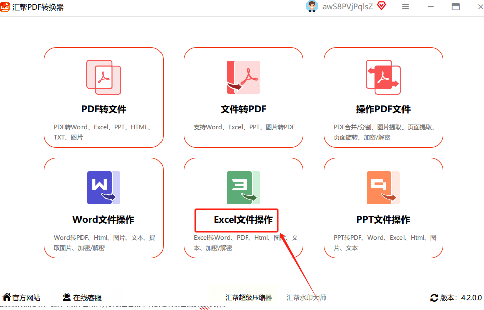 先打开“汇帮PDF转换器。打开后你会看到主界面,上面有很多功能选项,咱们要找的是“Excel文件操作”。点一下这个选项,就能进入到Excel相关的功能页面啦。