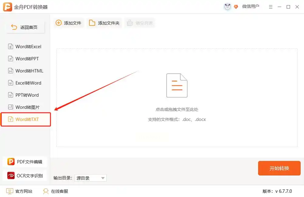 步骤二:左侧导航栏选择“文本转Word”选项,右侧区域通过拖拽或点击添加需要转换的TXT文件
