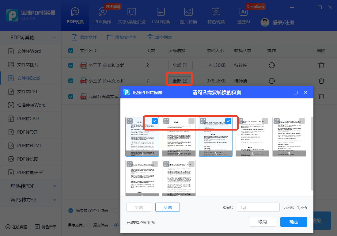 步骤三:此时会弹出转换设置对话框。您可以设置输出Excel的版本格式,并选择转换的页面范围。
