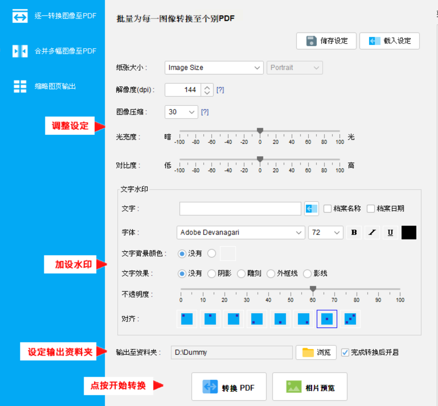 PhotoPDF是面向专业用户的图像PDF转换利器,特别适合对输出质量有严苛要求的场景。软件支持BMP、JPG、GIF等主流图像格式,并提供三种灵活的转换模式:单张图像独立成PDF、多图合并为一个PDF文件,以及以缩略图形式输出PDF页面。