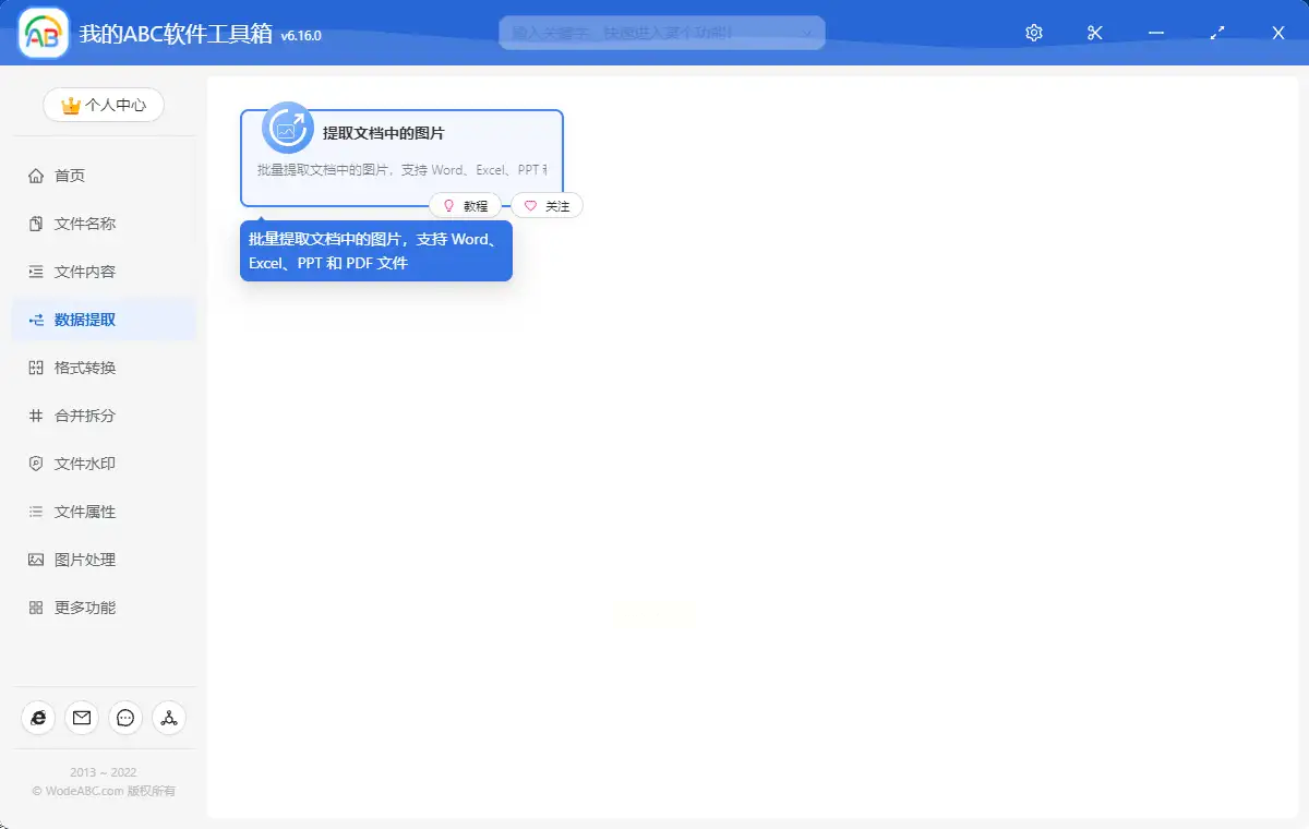 1. 启动功能模块:打开软件→选择「数据提取」→「提取文档中的图片」
