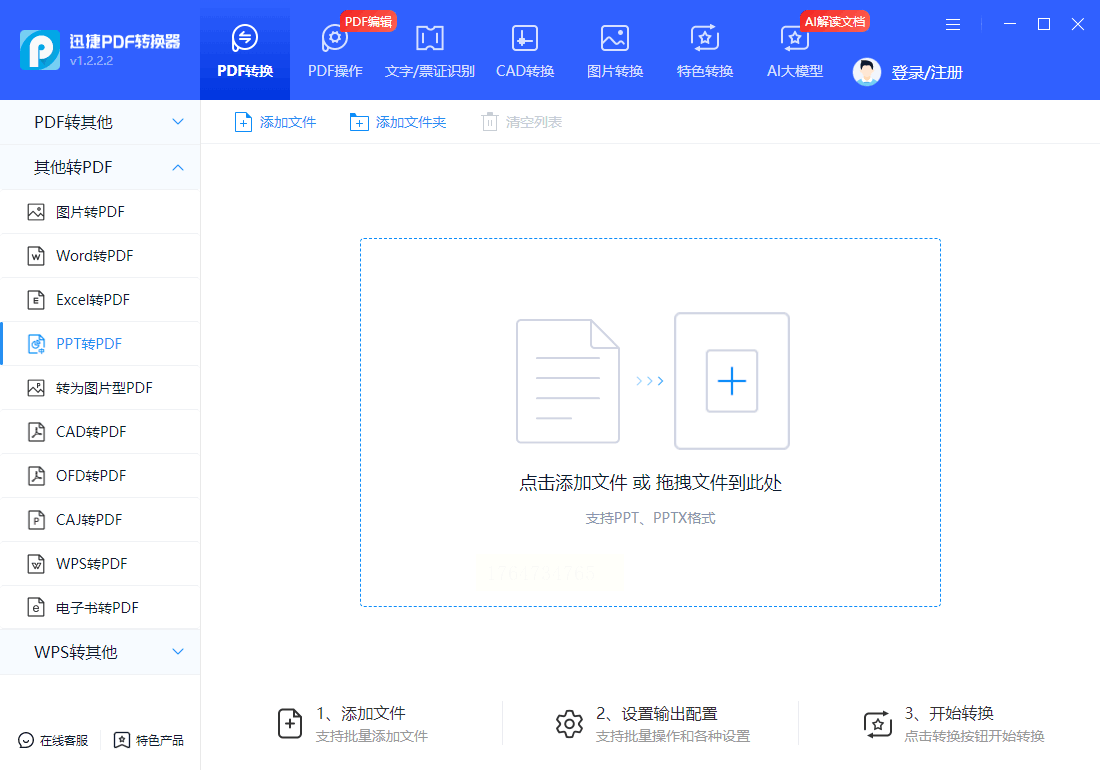 左侧功能栏清晰展示“PPT转PDF”选项,支持单文件/文件夹导入。
