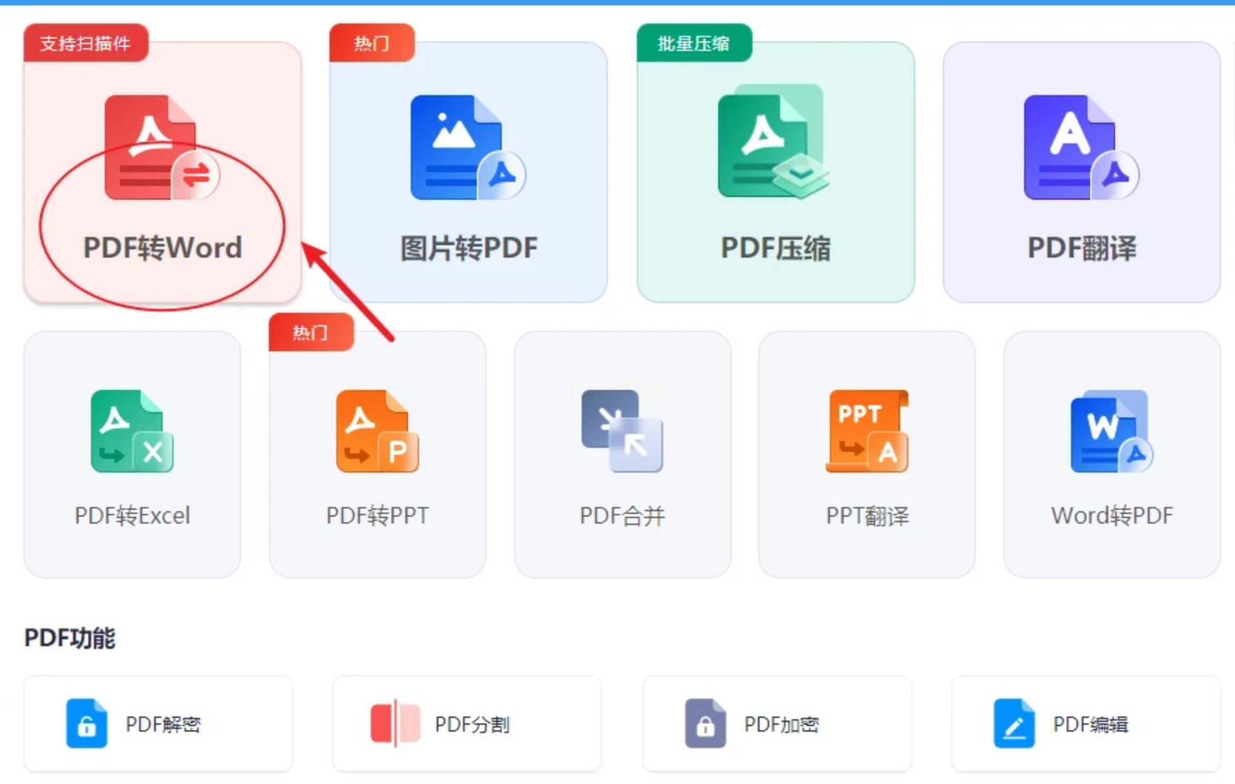 步骤一:在电脑上打开软件,在主界面众多功能图标中,找到并点击“PDF转Word”。