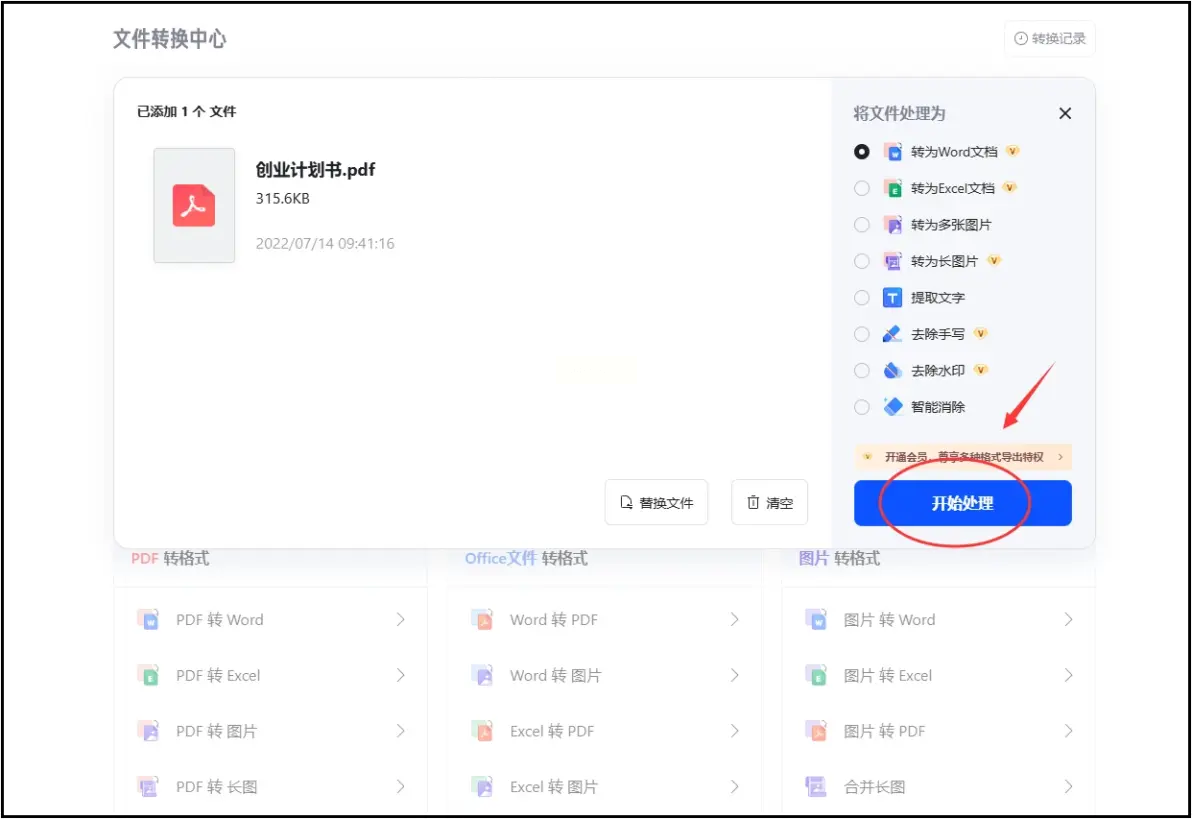3. 上传完成后,点击处理按钮,等待系统完成转换后,直接将Word文档保存到本地即可。
