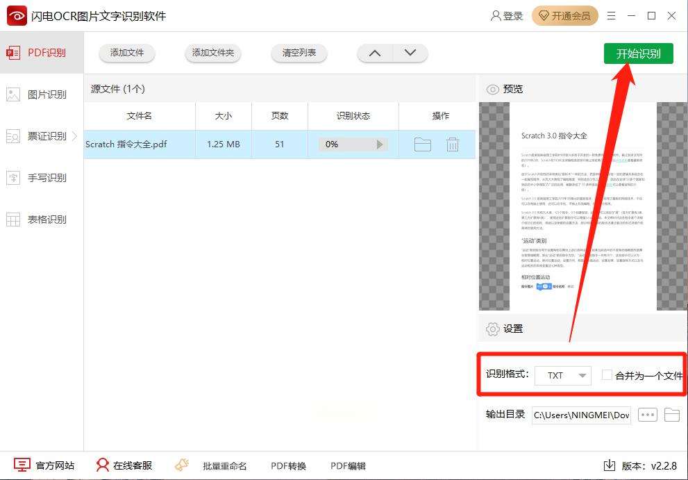 步骤二:在输出格式中勾选TXT,点击“开始识别”按钮,软件会自动提取文字并生成文本文件。
