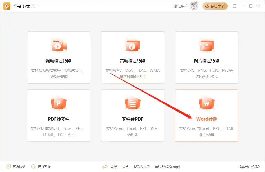 步骤一:打开《金舟格式工厂》软件,在首页或功能分类中找到“Word转换”或“文档转换”大类。