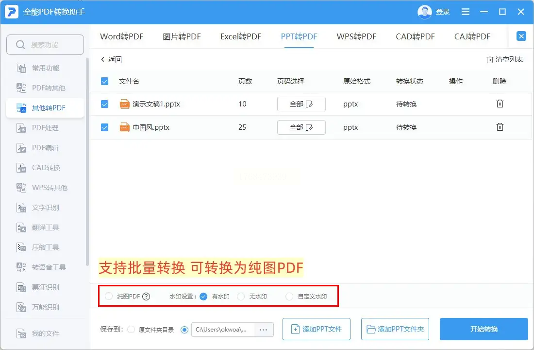 步骤一:启动《全能PDF转换助手》,使用其“PPT转PDF”功能,上传您的文件并执行转换,在此步骤中请注意保持输出PDF为可检索文字状态,而非纯图像PDF。