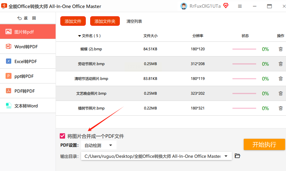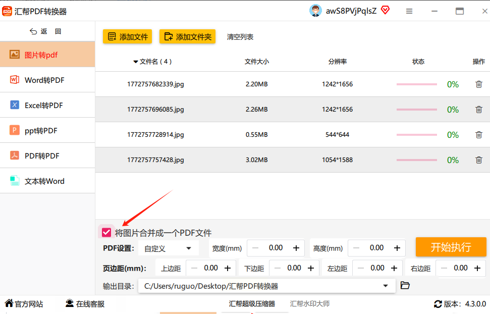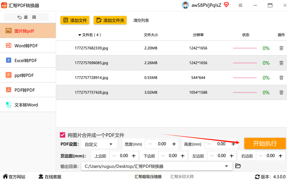 6. 开始转换:点击「开始执行」,等待进度条完成后,软件会自动打开输出文件夹,即可查看合并后的PDF文件。