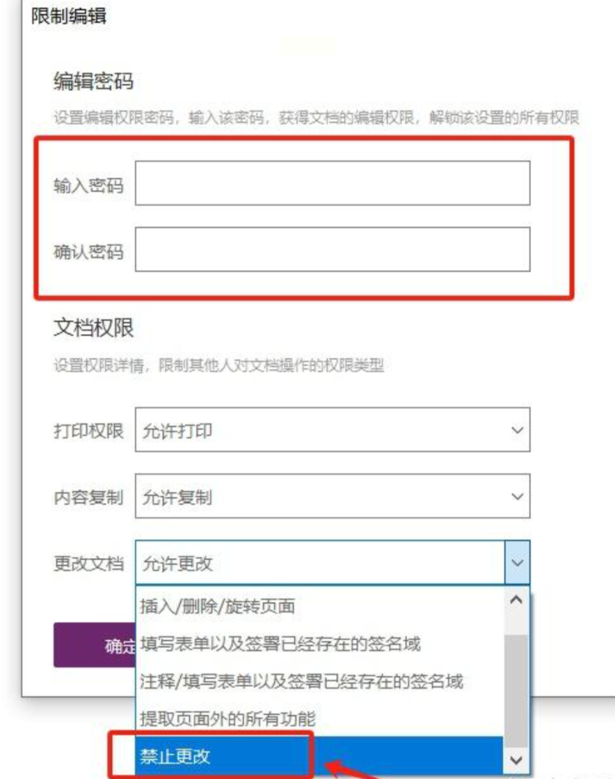 4. 在“更改文档”选项中,选择“禁止更改”,这样其他用户就无法编辑文档内容了。如果你还有进一步的需求,可以在“打印权限”和“内容复制”选项中设置是否允许打印或复制内容,从而灵活控制文档的使用权限。