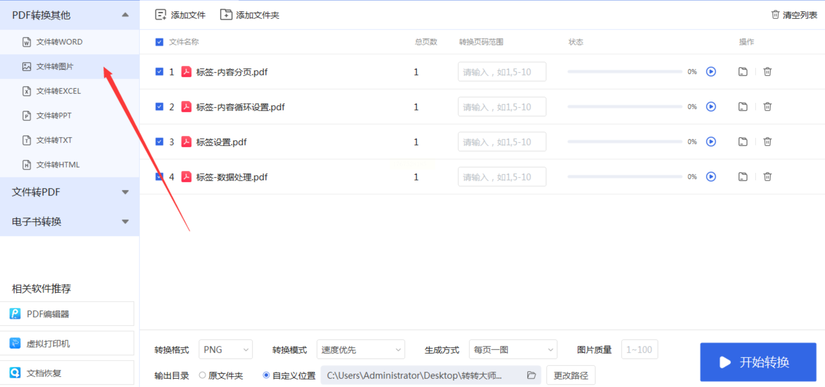 2. 在主界面中选择“PDF转换”功能,然后点击“文件转图片”选项。