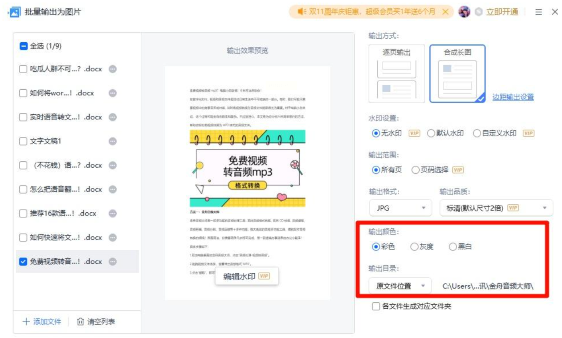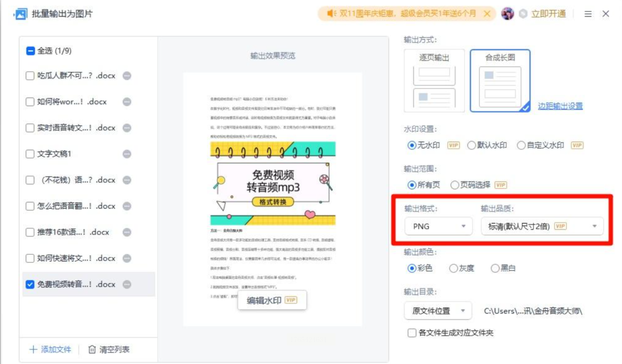 步骤三: 在输出前,你可以自由选择输出格式、调整图片质量以平衡清晰度和文件大小。同样,也具备生成单张长图的功能选项。