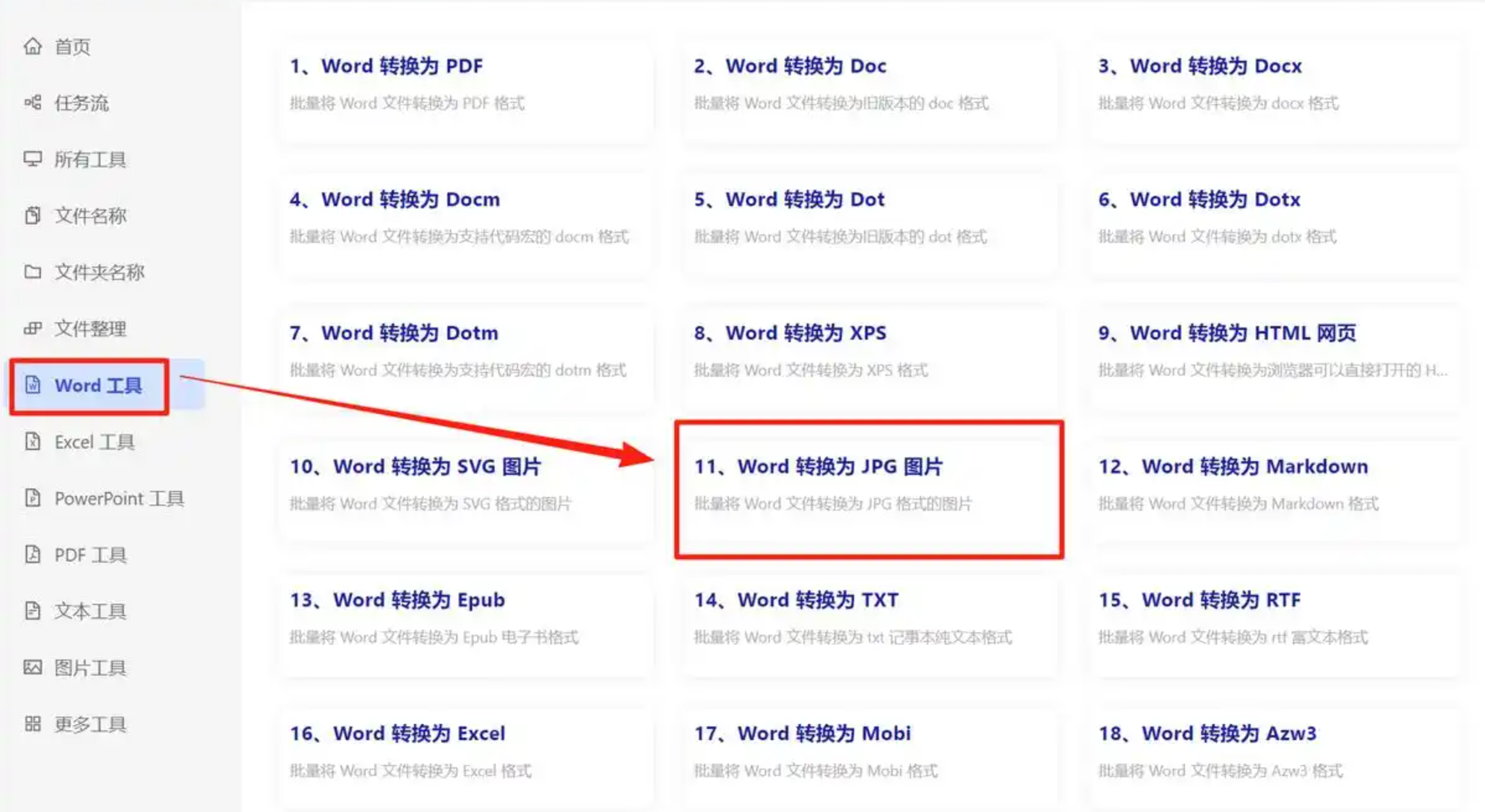 步骤一: 打开批量处理工具,在功能列表里选择“Word转图片”相关选项。