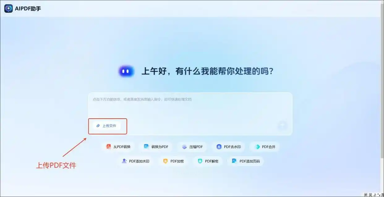 2. 点击“上传文件”,选择本地PDF文档(单次上传文件大小不超过20MB,超出需拆分或付费升级)。