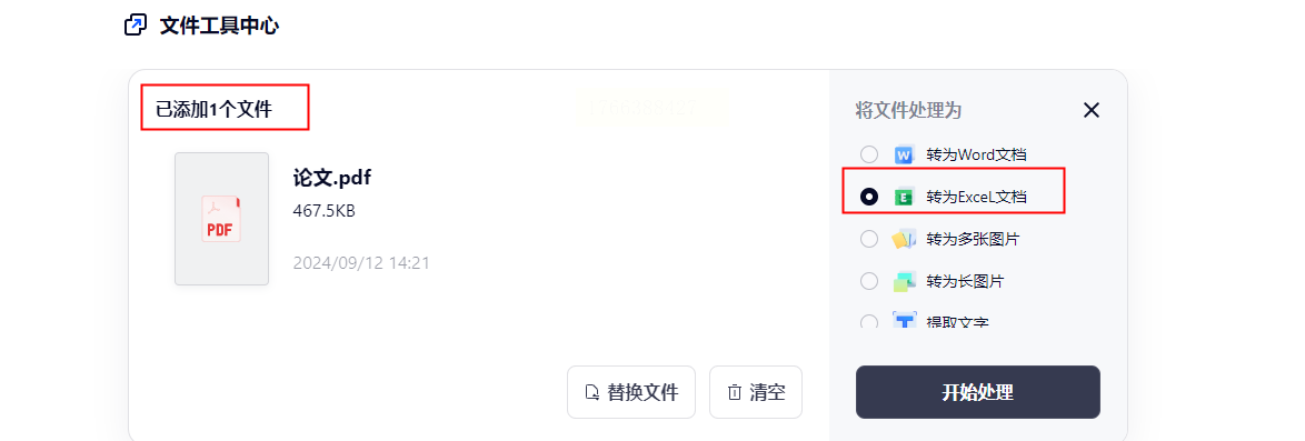 步骤三:文件上传后,通常可以在输出格式列表里确认选择“Excel”格式。部分工具会提供基础设置,如选择转换页码。