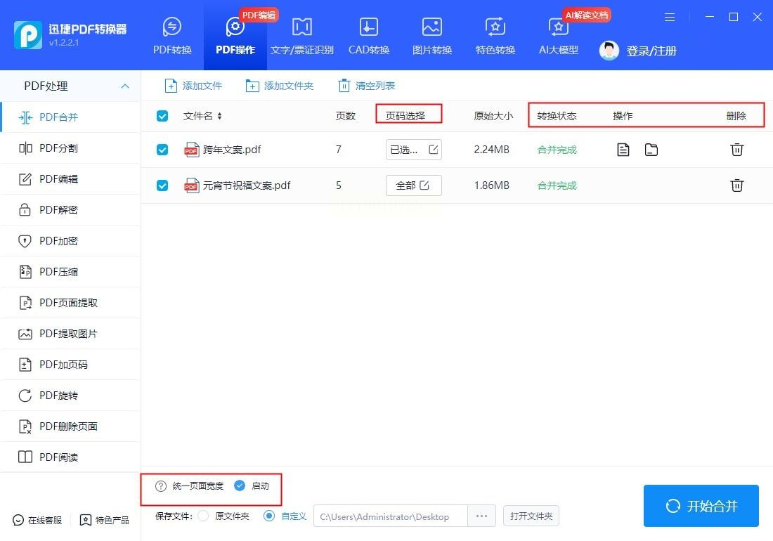 步骤三:文件添加完毕后,软件下方会提供一些增强选项。例如,您可以选择将合并后的PDF统一转换为图片型PDF,以确保在任何设备上显示效果都绝对一致;还可以勾选“统一页面宽度”来规范不同源文件的页面尺寸。根据实际需求完成这些设置后,即可点击“开始转换”按钮。