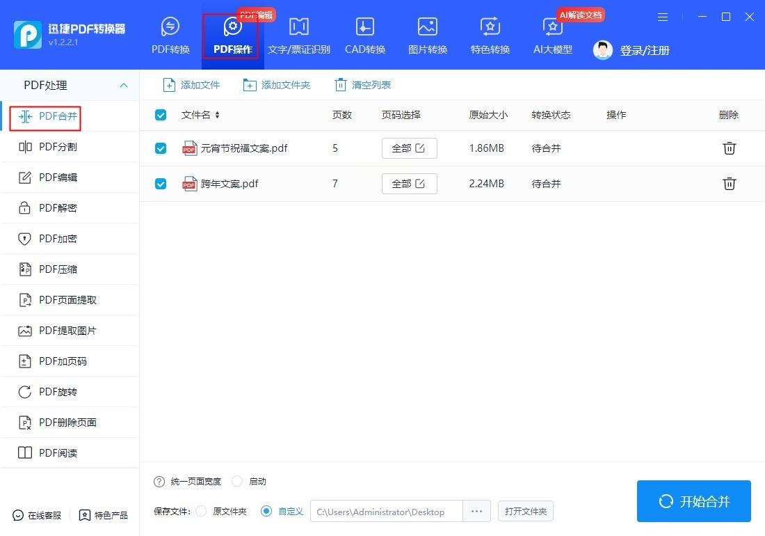 步骤一:启动软件后,在上方功能分类中选择“PDF操作”,然后在左侧功能列表中找到并点击“PDF合并”。