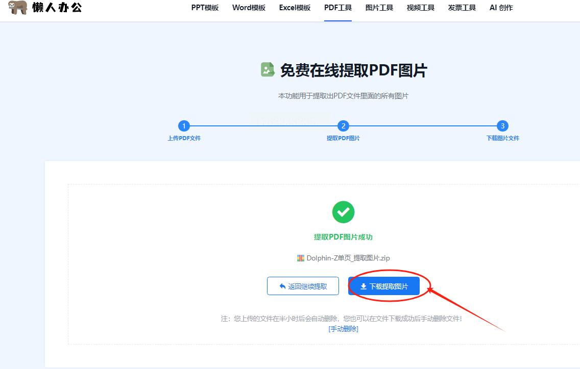 4. 完成提取:文件上传后自动开始处理,点击“下载提取图片”即可将所有图片打包保存。