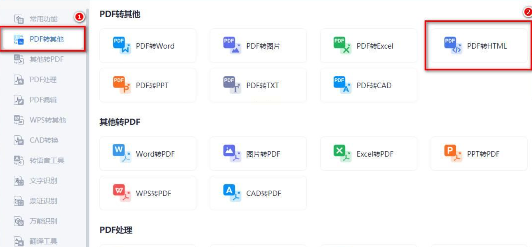 1. 打开软件后,左侧菜单选择“PDF转其他”,右侧列表中点击“PDF转HTML”;