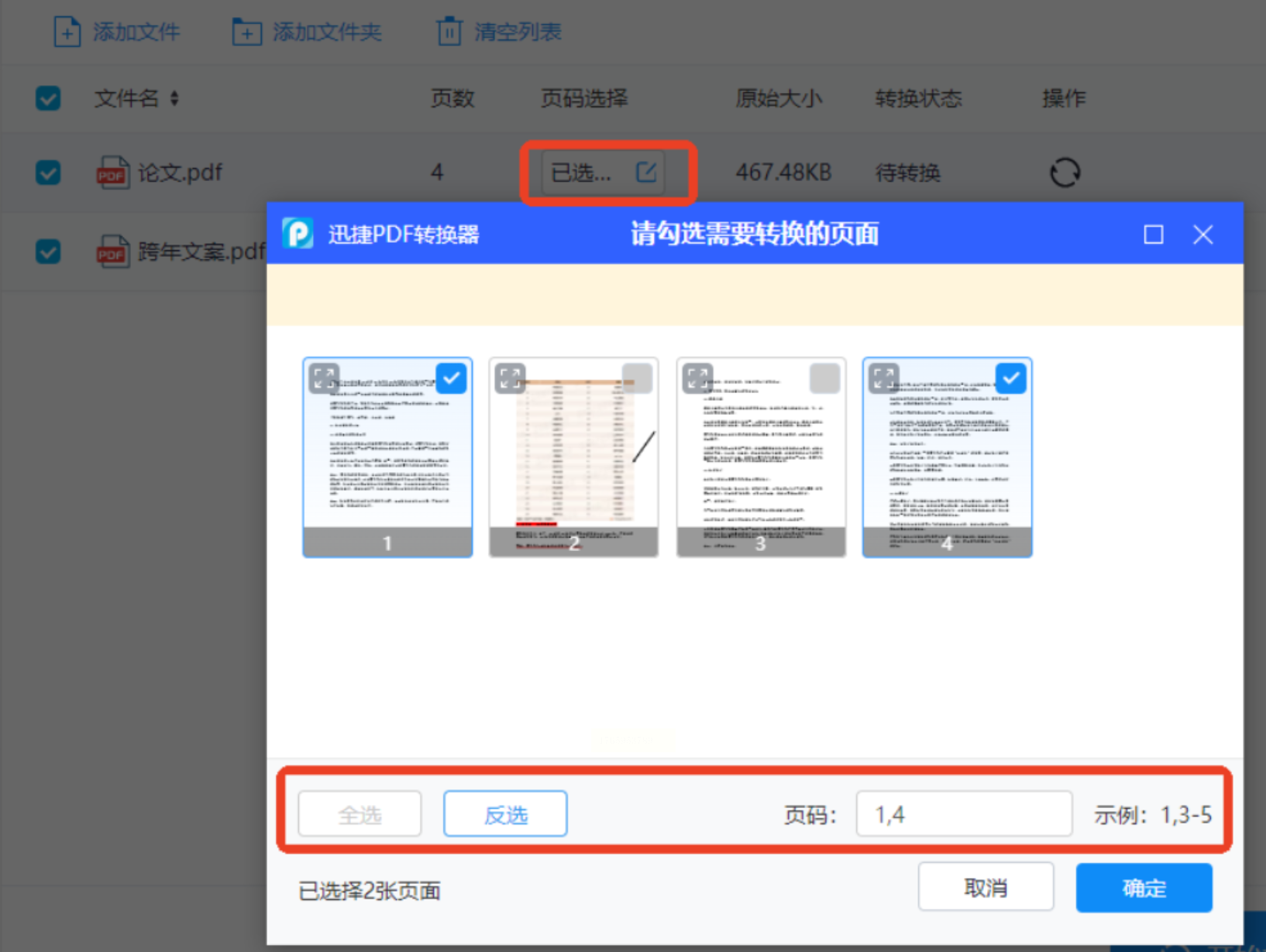 - 勾选“全选”“反选”按钮快速调整页码范围;