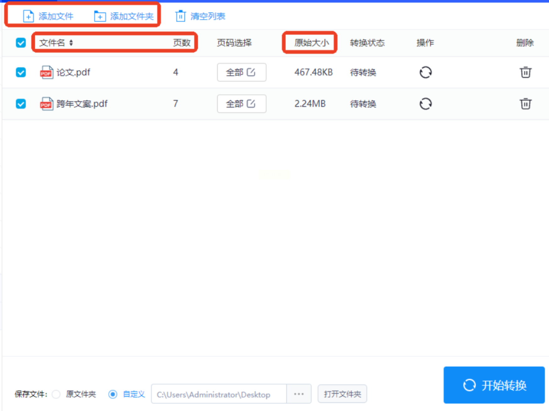 2. 批量导入文件:点击“添加文件”选择多个PDF,或直接拖入文件夹,界面实时显示文件名称、页数及大小;