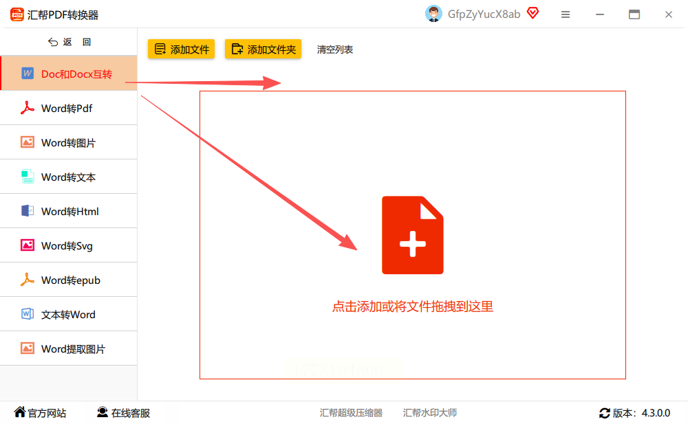 3. 在右侧文件区域点击「添加文件」按钮,支持批量拖拽或点击上传多个docx文件
